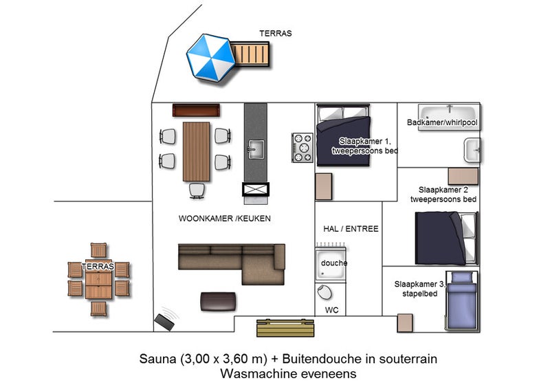 - benedenruimte met 5- persoons Finse sauna, wasmachine, droger, minivriezer, barbeque.